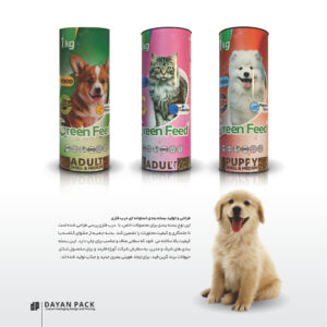 جعبه استوانه ای مقوایی برای محصولات خاص، با درب فلزی پرسی طراحی شده است تا ماندگاری و کیفیت محتویات را تضمین کند. بدنه جعبه از مقوای گلاسه با کیفیت بالا تولید می شود . که سطحی صاف و مناسب برای چاپ دارد که روی بدنه اصلی مقوایی را پوشش می دهد. این بسته بندی های شیک ومدرن، به سفارش شرکت آویژه فارمد در تیراژ بالا و برای محصول غذای حیوانات برند گرین فید، ایجاد هویت بصری جدید و جذاب تولید شده اند.