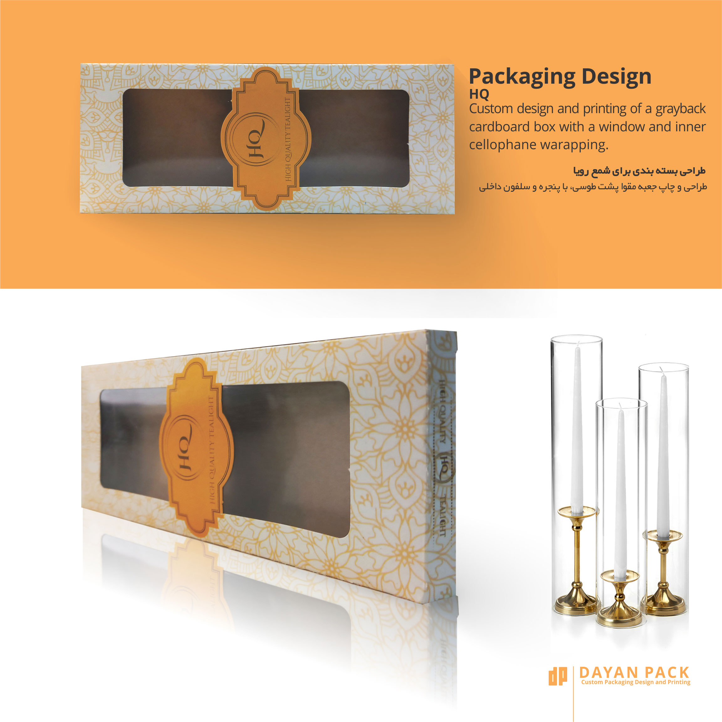 طراحی و چاپ جعبه شمع مقوا پشت طوسی، با پنجره و سلفون داخلی