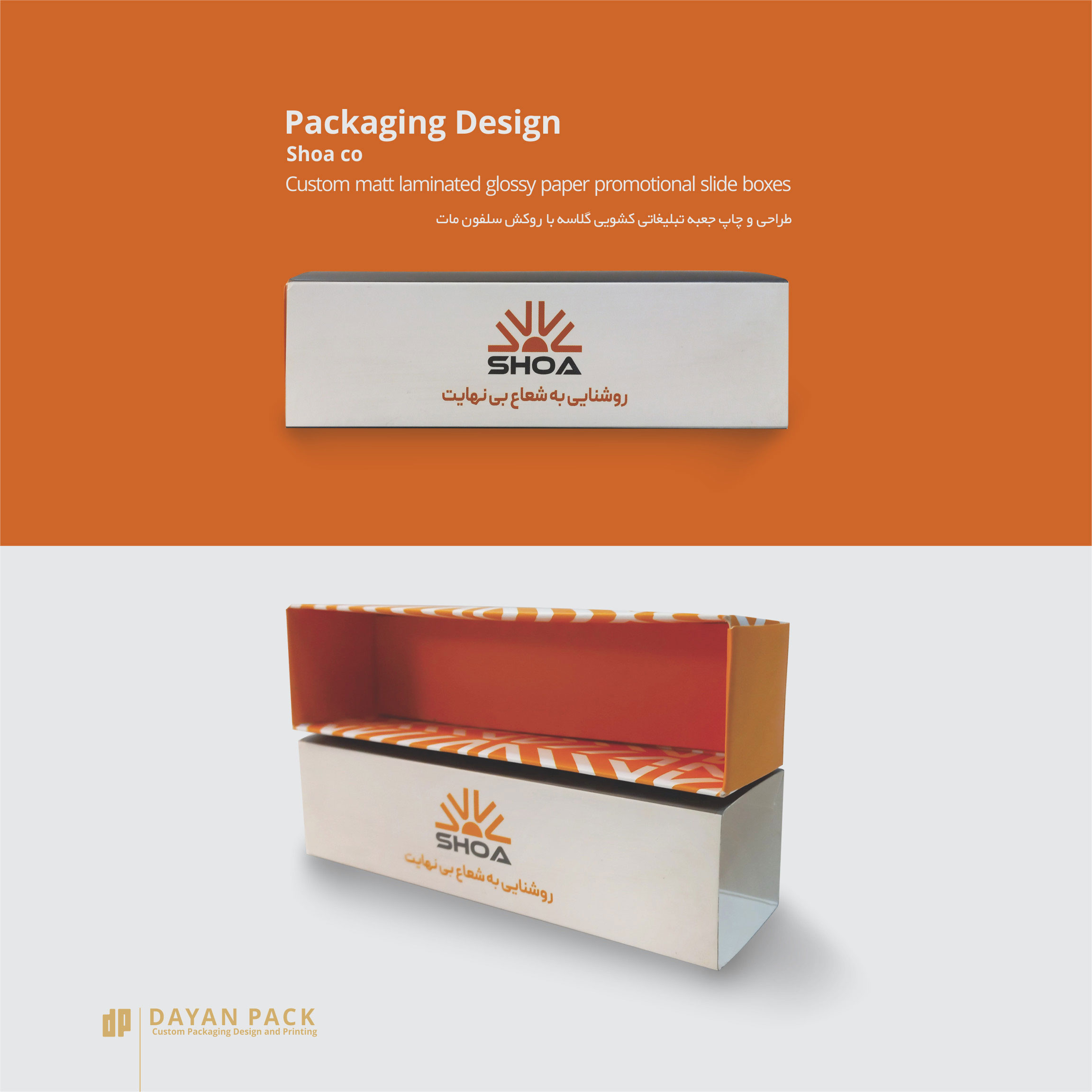 طراحی و چاپ جعبه صنايع روشنايی تبلیغاتی کشویی گلاسه با روکش سلفون مات
