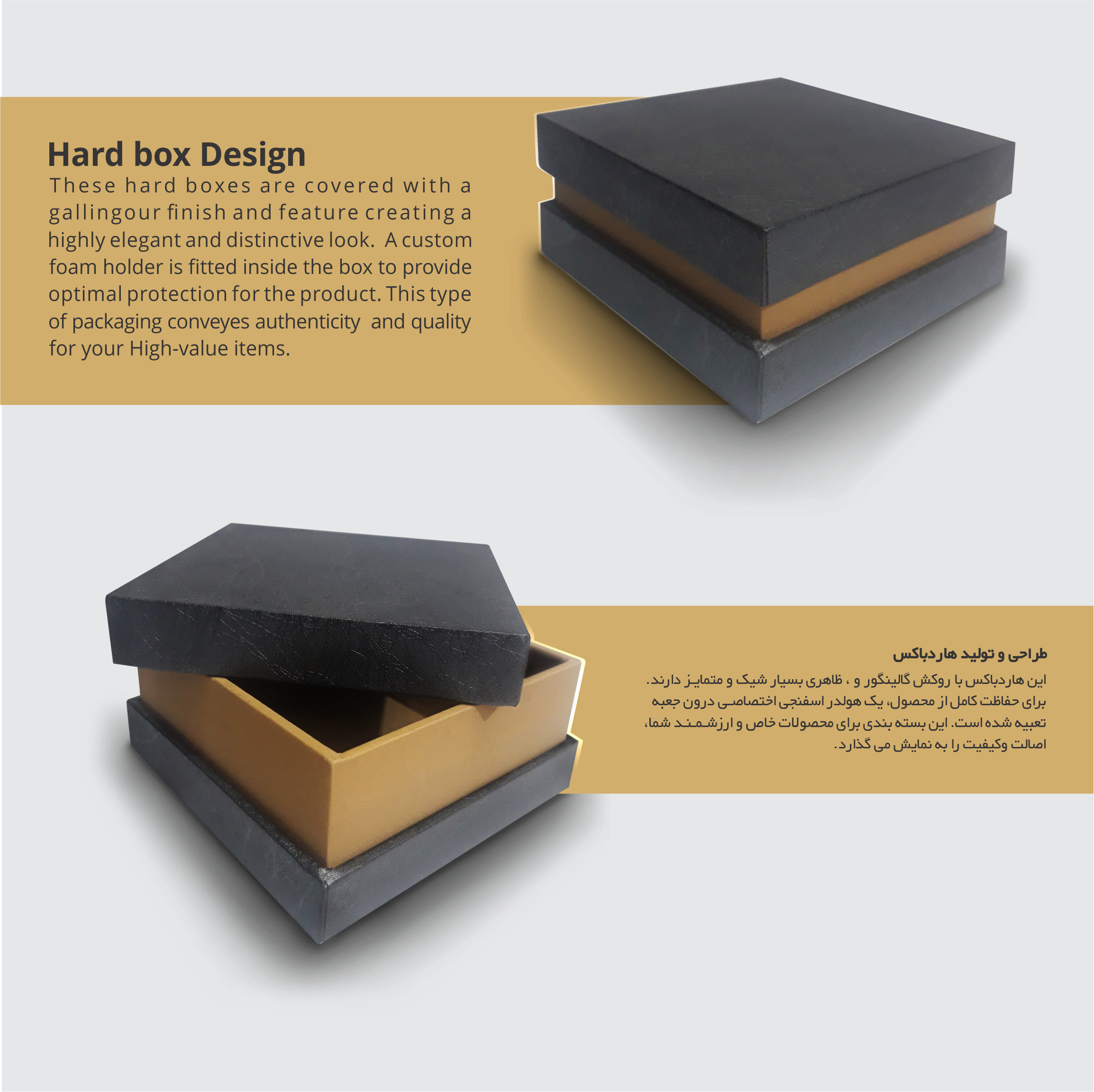 طراحی و چاپ هاردباکس با استفاده از چهار رنگ، رنگ ها و طرح های مورد نظر شما را با بالاترین کیفیت نمایش میدهد. روکش سلفون مات نیز علاوه بر ایجاد جلوه ای شیک و مخملی، مقاومت جعبه را در برابر خط و خش و رطوبت افزایش می دهد . این نوع بسته بندی برای محصولات ارزشمند و لوکس مانند عطر، جواهرات، گل و هدایا ایده آل است. و این نوع هاردباکس مناسب کادویی و عروسی (البته باطراحی ظاهری مناسب شما)نیز می باشد.