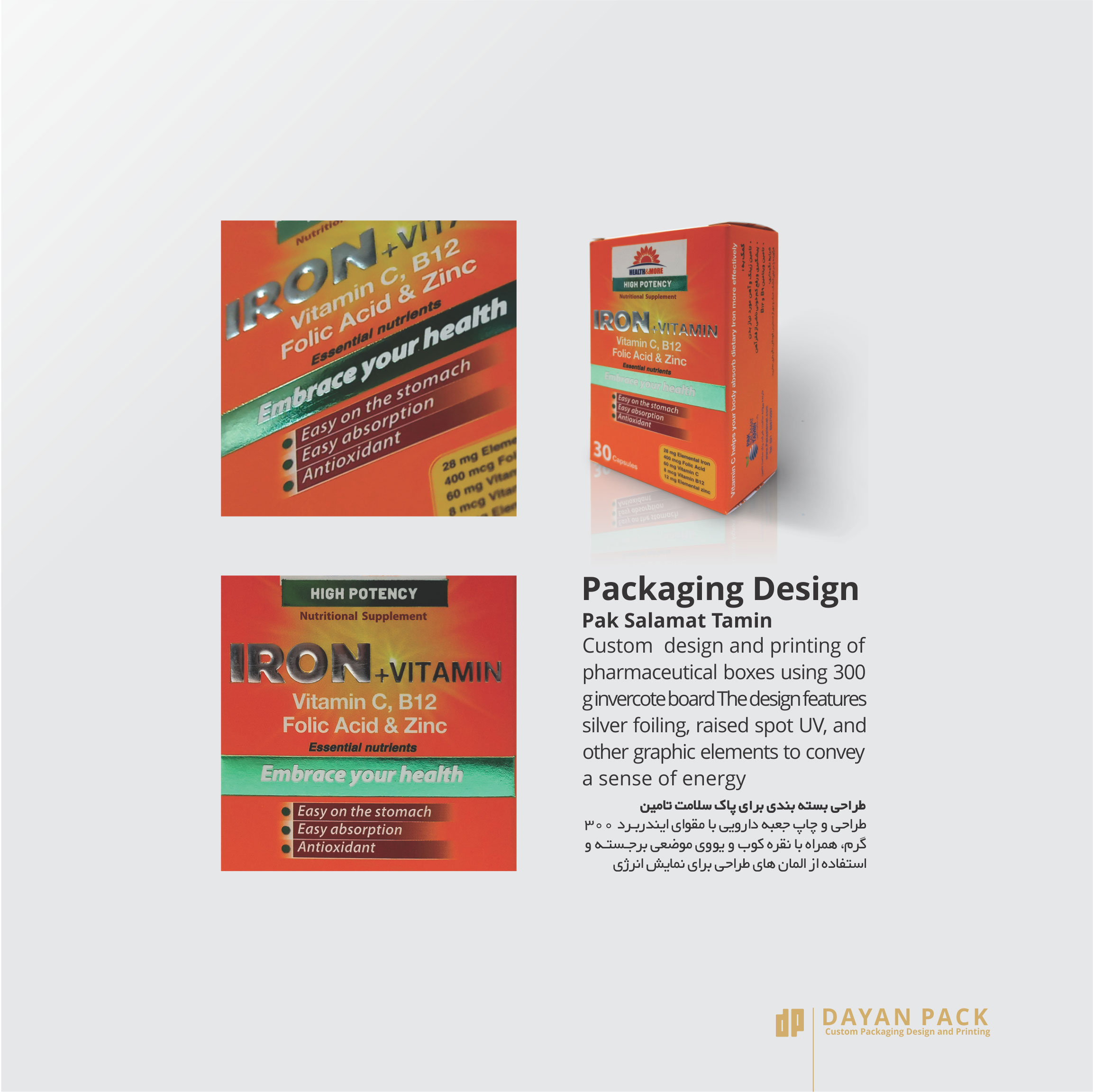 نمونه چاپ جعبه دارویی برای پاک سلامت تامین نشان میدهد که چگونه دایان پک با استفاده از متریال و تکنیکهای استاندارد، بستهبندیهایی تولید میکند که عاری از هرگونه آلودگی بصری و فیزیکی هستند.