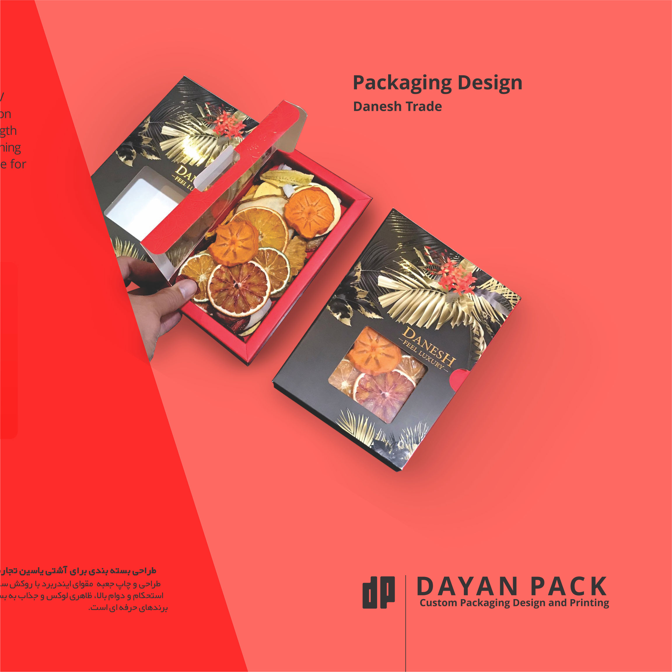 طراحی و چاپ جعبه صنایع غذایی با مقوای ایندربرد روکش سلفون مات، همراه با طلاکوب برجسته و پنجره دار برای میوه خشک