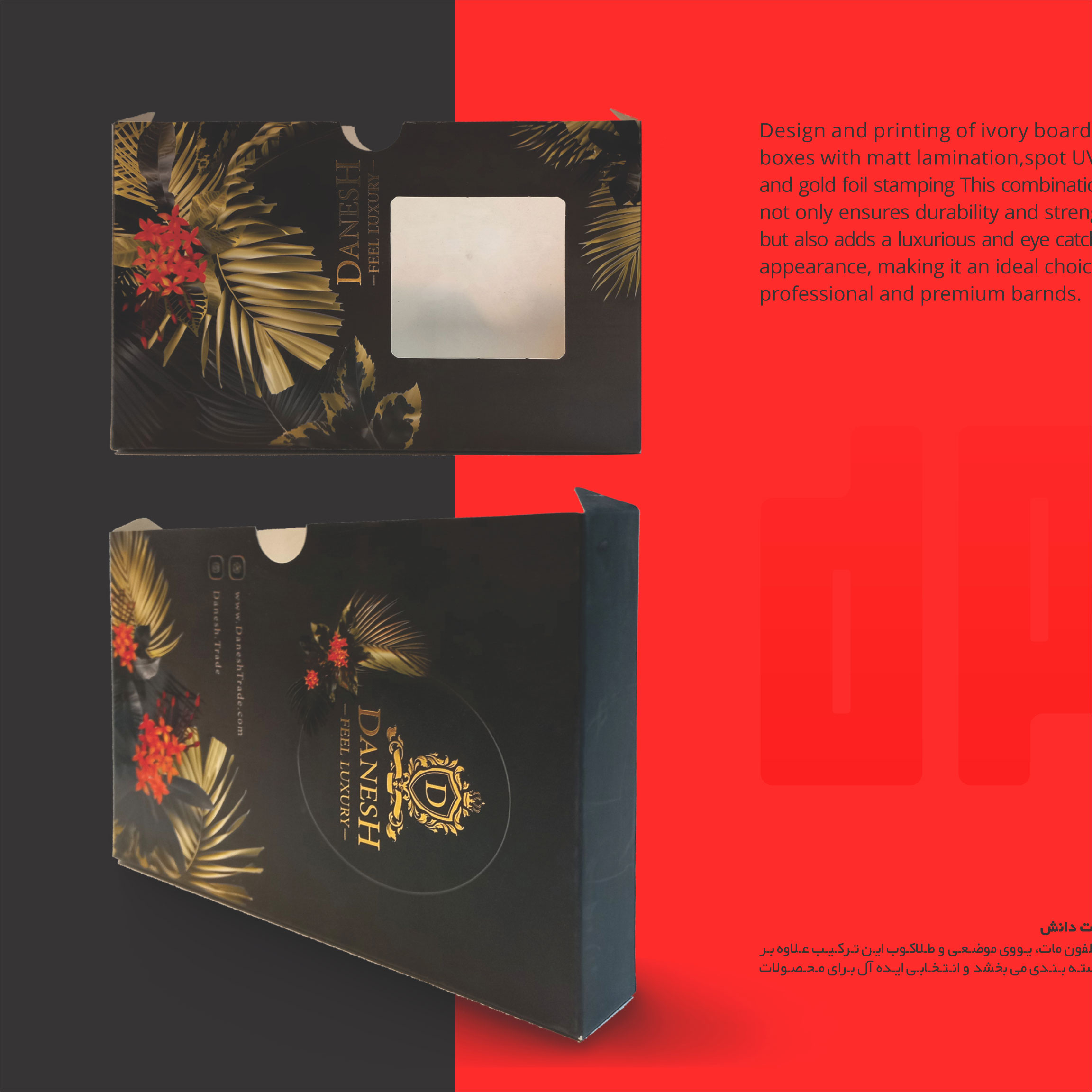 • طراحی پنجره‌دار: امکان طراحی جعبه‌هایی با پنجره‌های شفاف، برای نمایش مستقیم کیفیت محصول و جلب اعتماد سریع مشتری.