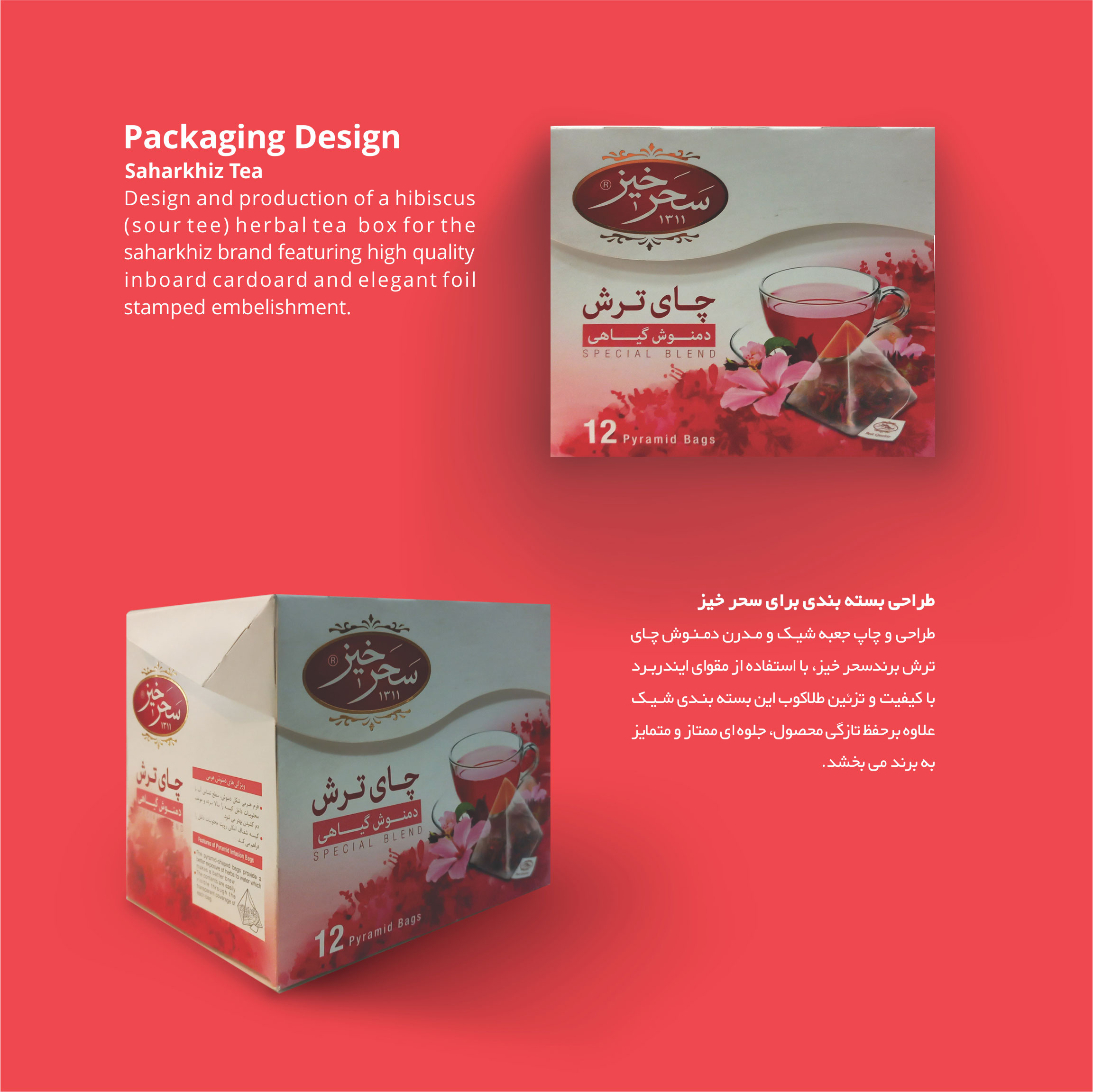طراحی و چاپ جعبه صنایع غذایی شیک و مدرن دمنوش چای ترش برند  سحر خیز، با استفاده از مقوای ایندربرد باکیفیت و تزئین طلاکوب این بسته بندی شیک علاوه بر حفظ تازگی محصول، جلوه ای ممتاز و متمایز به برند می بخشد.