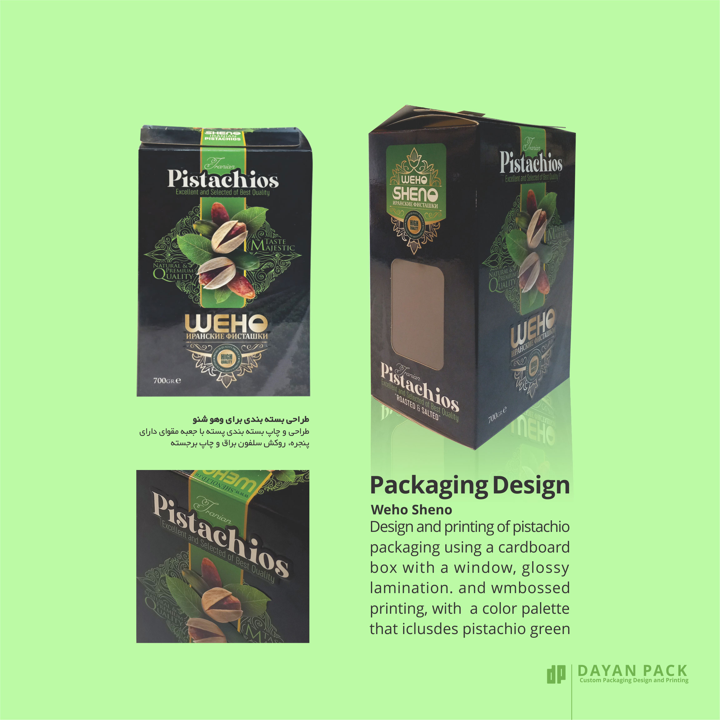 طراحی و چاپ جعبه صنایع غذایی پسته با جعبه مقوای دارای پنجره، روکش سلفون براق و چاپ برجسته